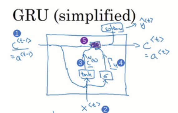 \[ \begin{aligned} &\widetilde{c}^{<t>}=tanh(W_{c}[\Gamma_r^{<t>} c^{<t-1>},x^{<t>}]+b_c)\\ &\Gamma^{<t>}_u=\sigma(W_{g}[c^{<t-1>},x^{<t>}]+b_u)\\ &\Gamma^{<t>}_r=\sigma(W_{r}[c^{<t-1>},x^{<t>}]+b_r)\\ &c^{<t>}=\Gamma^{<t>}_u\widetilde{c}^{<t>}+(1-\Gamma^{<t>}_u)c^{<t-1>} \end{aligned} \]