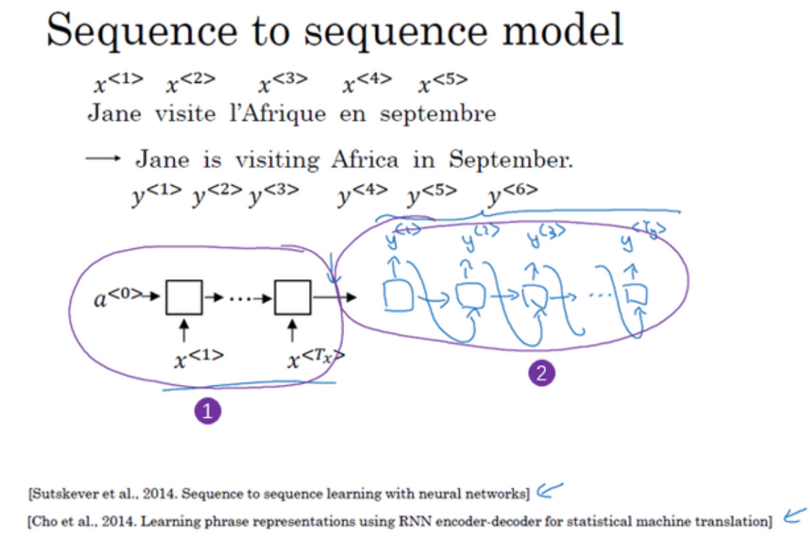 seq2seq model通常用在机器翻译上,即读入一个句子,输出翻译的句子,这可以用我们之前的many to many的RNN来实现.