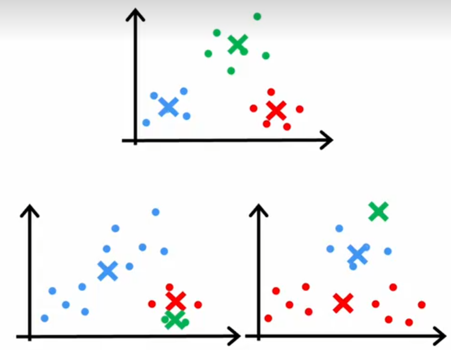 如图所示,这三种情况都可以使得算法终止迭代,但是肉眼可见的,只有最上面那种的聚类是符合我们要求的,如何避免陷入局部极小值是比较困难的,可能需要一些启发式手段,为了避免复杂化问题,我们只需要大量重复的调用聚类算法,并且每次初始值都不同,取最小的那个就好了,这样还是很容易能够找到全局最小的.
