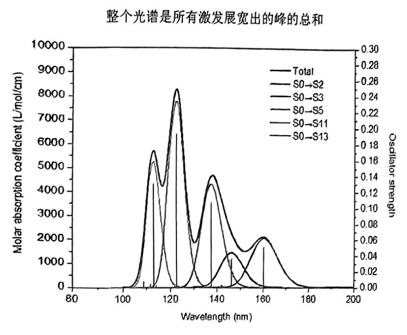 使用激发态计算可以得到吸收波长和振子强度,然后辅以适当的展宽函数,就可以得到能和实验谱图对照的理论电子光谱.